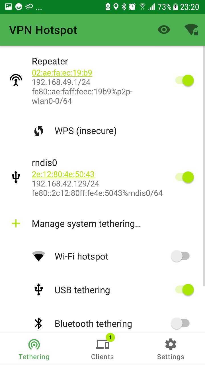 Now WiFi Repater and USB tether have been turened on. It works pretty well, although it runs a bit slow. Note you have to turn on rndis0 monitering for USB tether working at the same time with WiFi Repeter.